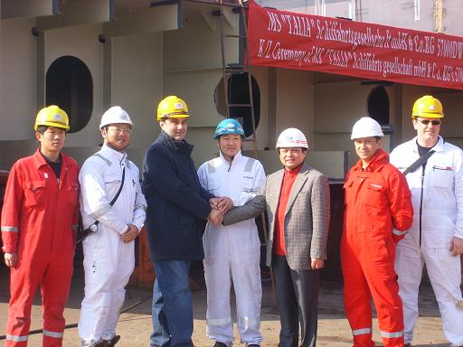 12月16日,在韓通船舶重工的船臺(tái)舉行了57000DWT散貨輪(HT016)上臺(tái)儀式,該船為德國(guó)Peter Dohle公司建造,入LR級(jí),是該船東系列船的第一艘,將在2009年3月下水,5月底交船,江蘇弘業(yè)公司提供保涵.