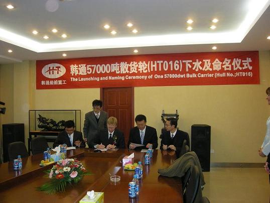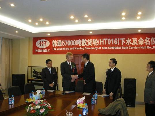 3月27日下午3:30,在韓通重工的1#船臺(tái),隆重舉行了PD船東的首制57000噸散貨輪(船號(hào):HT016)的下水儀式,參加儀式的有船東代表、LR船級(jí)社、貿(mào)易公司代表、銀行代表等相關(guān)人員。公司領(lǐng)導(dǎo)孟成君董事長、武亦文總經(jīng)理參加了儀式,并發(fā)表了熱情洋溢的講話,在武亦文總經(jīng)理的講話中,他代表孟成君董事長感謝船東的理解和支持,感謝貿(mào)易公司和銀行的大力支持。該首制船的成功下水也將韓通與國際知名船東PD的合作又向前推進(jìn)了一大步。儀式后,又舉行了HT017的上臺(tái)儀式,并在公司5#會(huì)議室簽訂了下水和上臺(tái)的相關(guān)文件。