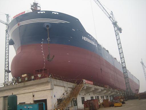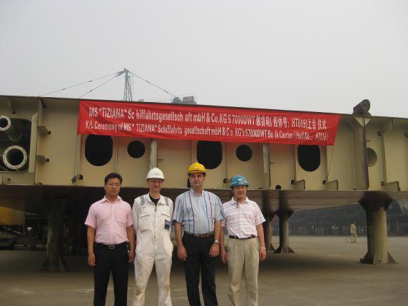 2009年6月13日清晨7:00,PD項(xiàng)目的第二艘57000噸散貨輪(船體號(hào):HT017)在韓通重工的1號(hào)船臺(tái),1號(hào)滑道迎著朝陽(yáng)順利下水。該散貨輪代理公司為江蘇弘業(yè)股份有限公司,入LR船級(jí)社。韓通重工領(lǐng)導(dǎo)、船東代表、代理公司代表和LR代表共同迎接了這一激動(dòng)人心的時(shí)刻。隨后在同一船臺(tái)PD項(xiàng)目的又一艘57000噸散貨輪(船體號(hào):HT019)舉行了上臺(tái)儀式。