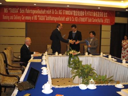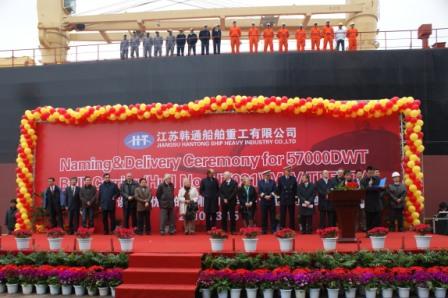 2010年3月15日,韓通船舶重工有限公司為SPLOSNA PLOVBA公司建造的第一艘57000噸散貨輪(HT021)達(dá)到了交船狀態(tài),在韓通重工碼頭為該艘舉行隆重的命名及交船儀式。SPLOSNA PLOVBA公司 Egon Bandelj先生,圣母Alenka Malej女士,Peter Doehle公司W(wǎng)erner Gerdts先生,江蘇弘業(yè)股份有限公司船舶部總經(jīng)理季轟,英國(guó)勞氏船級(jí)社中國(guó)中部地區(qū)商務(wù)經(jīng)理林立先生、江蘇韓通船舶重工有限公司常務(wù)副總陳林軍先生共同見(jiàn)證了這一激動(dòng)人心的時(shí)刻,并發(fā)表了精彩的演講。各位貴賓在陳總的陪同下登船參觀了這艘散貨輪,并在船上合影留念。