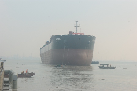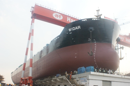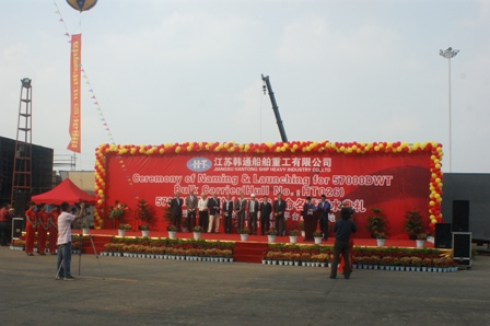2010年10月8日江蘇韓通船舶重工有限公司迎來(lái)了又一個(gè)值得慶祝和紀(jì)念的日子—HT026的命名及下水儀式。該57000DWT散貨輪為我司為船東PD建造,入LR船級(jí)社,該船被命名為“WIDAR”。韓通重工副總經(jīng)理陳興先生,塔姆克航運(yùn)公司迪特里?!に房讼壬ツ缚死锼雇∧取た破湛?,Peter Doehle公司W(wǎng)erner Gerdts先生,英國(guó)勞氏船級(jí)社高級(jí)驗(yàn)船師田莊先生等參加了該儀式并發(fā)表講話。