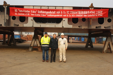 我司為德國(guó)船東建造的57000噸散貨輪(船體號(hào):HT044)于2010年12月21日下午14:00在我司1號(hào)船臺(tái)舉行了上臺(tái)儀式,該船入LR船級(jí)社,計(jì)劃于2011年7月31日交船。陳林軍常務(wù)副總及船東船檢代表參加了該儀式。