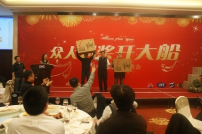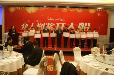 團拜會現(xiàn)場分為兩個部分——表彰大會和迎春晚宴。表彰大會由陳興副總主持,分別由陳林軍常務副總等公司高層為2010年度韓通優(yōu)秀員工,韓通優(yōu)秀班組,海洋優(yōu)秀個人與班組,中冶優(yōu)秀個人與班組,文景優(yōu)秀個人,韓通優(yōu)秀外包施工班組以及韓通優(yōu)秀勞務公司頒獎,此時在各工作崗位上辛勤工作了一年的同事們成了彩光燈下最耀眼的明星。