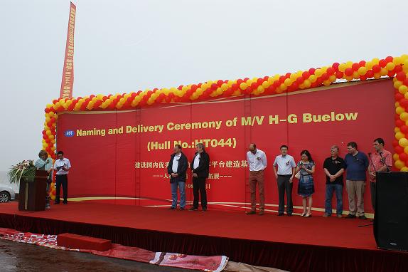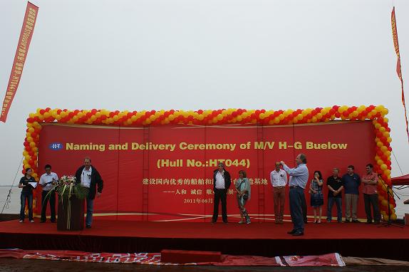 我司為PD建造的57000噸散貨輪(HT044)達(dá)到了交船狀態(tài),2011年8月18日在江海碼頭舉行了隆重的命名及交船儀式,被命名為“H-G BUELOW”。該船入英國(guó)勞氏船級(jí)社。儀式結(jié)束后,船東船檢代表等參觀了該船,并給予很高的評(píng)價(jià)。至此,該船成功交付。