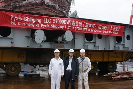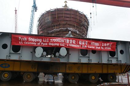 我司為Eagle Bulk船東建造的57000DWT散貨輪(船體號:HT099)于2011年12月8日上午10:00在我司1號船臺舉行了上臺儀式,該船入LR船級社。潘學軍副總及船東船檢代表參加了該儀式。