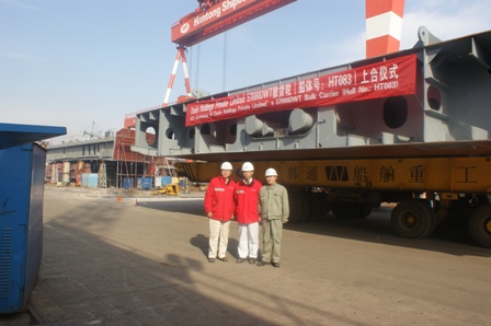 我司為大新船東建造的57000DWT散貨輪(船體號(hào):HT083)于2011年12月23日上午10:00在我船臺(tái)舉行了上臺(tái)儀式,該船入BV船級(jí)社。李繼念副總及船東船檢代表參加了該儀式。