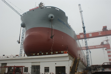 2014年3月29日,我司為日新建造的64000噸散貨輪(HT64-127)在韓通1號(hào)船臺(tái)成功下水,該船入BV船級(jí)社。周義慶副總經(jīng)理、船東代表及船級(jí)社代表參加該儀式。