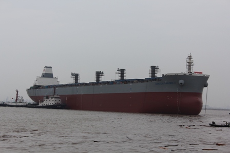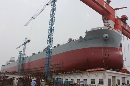 2014年8月12日,我司為日新船東建造的64000噸散貨輪(HT64-129)在韓通3號船臺成功下水,該船入BV船級社。周義慶副總經(jīng)理、船東代表及船級社代表參加該儀式。