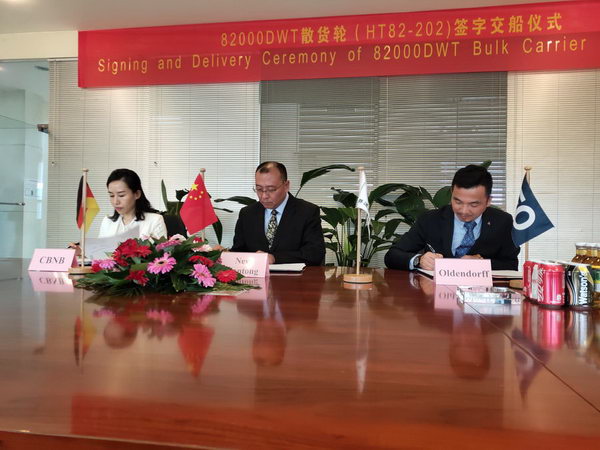 2019年5月29日,韓通船舶重工為德國(guó)船東Oldendorff建造的82K散貨輪 “Kim Oldendorff”(船體號(hào):HT82-202)成功舉行命名儀式, 并順利簽字交船。