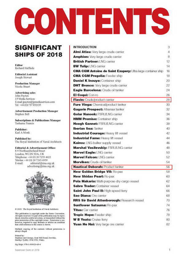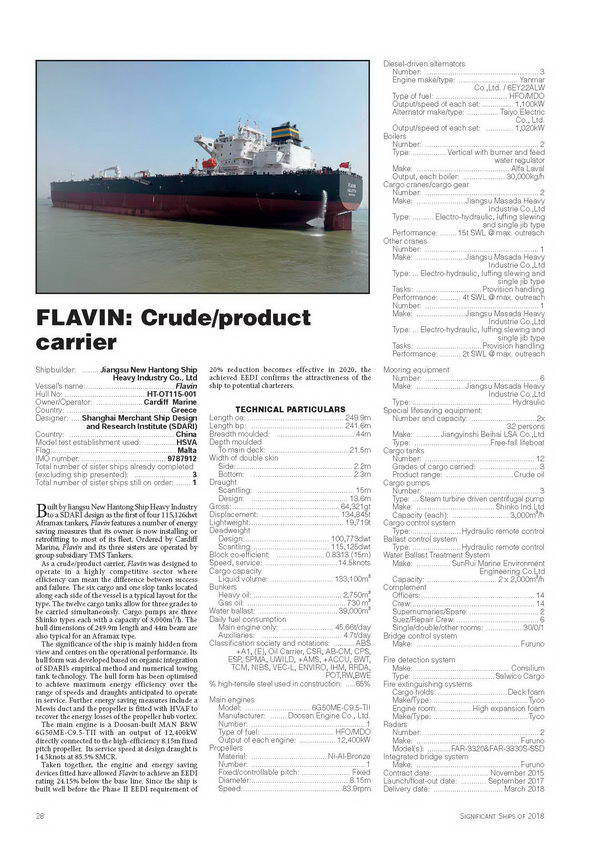 韓通為挪威客戶TRF建造的74000噸成品油輪(船體號:HT-OT74-007)及希臘客戶Cardiff建造的114000噸油輪(船體號:HT-OT115-001)入選 SIGNIFICANT SHIPS OF 2018(Published by The Royal Institution of Naval Architects)。